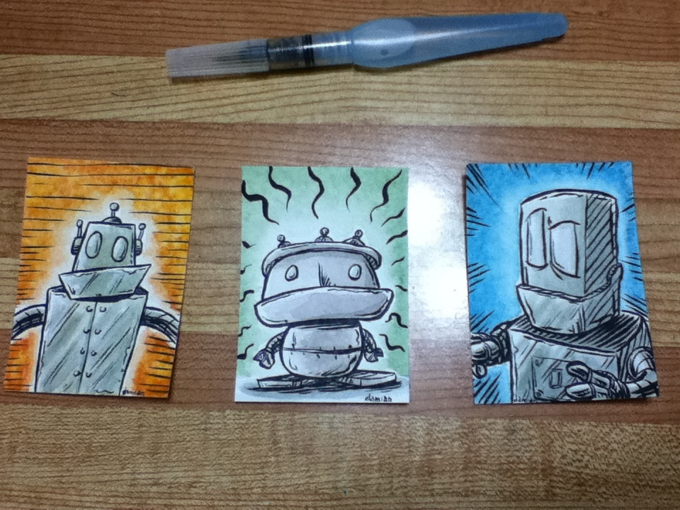 Here are some awfully tiny robot paintings made with brushpen inks and watercolour: